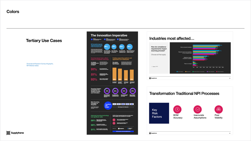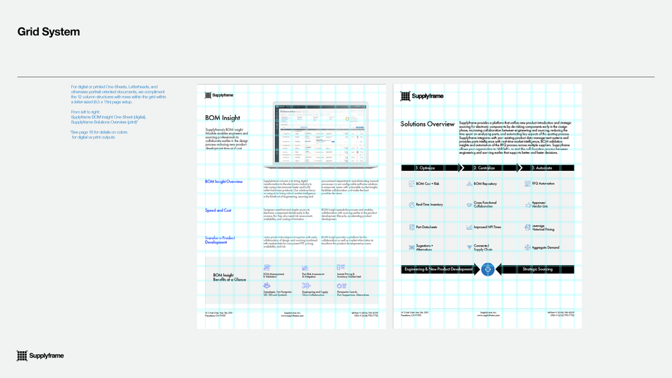 Brand and Identity Guidelines for Supplyframe, the leading Design-to-Source Intelligence platform for the global electronics value chain. This ever-evolving document lays the foundation for the identity of the Supplyframe brand, its network sites, intelligence platform, and (DSI) solutions. Taking Swiss design fundamentals and synchronizing type, color, and grid systems with modern web UI styles, the brand takes on a life of its own and separates itself as the global standard in the electronics supply chain industry.